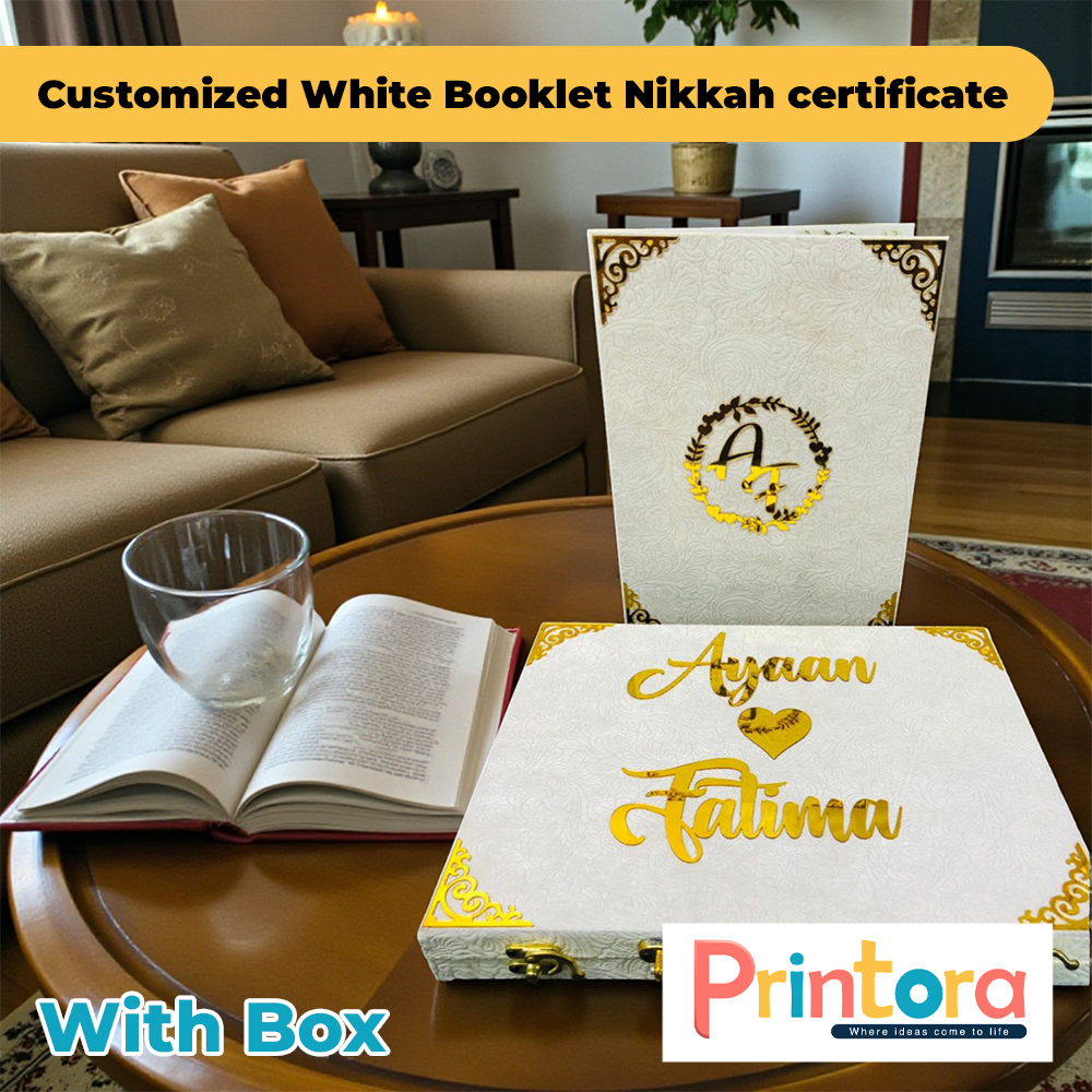 The White Nikkah Certificate Booklet with Box is designed for couples who prefer a clean, sophisticated, and timeless look. Featuring a premium white textured cover with elegant gold detailing and customized couple names, this booklet enhances the beauty of your Nikkah ceremony.