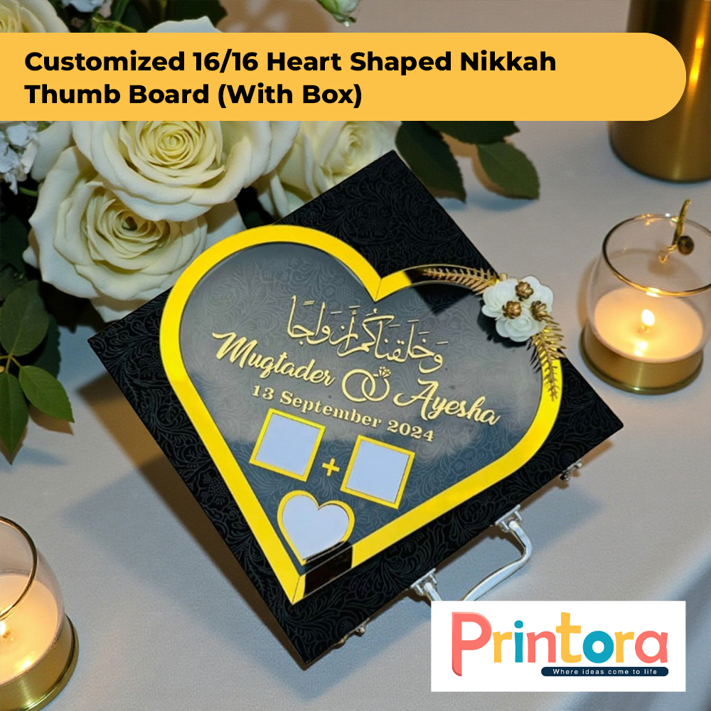 The 16×16 Heart Shaped Nikkah Thumb Board is designed for couples who want a larger and more eye-catching display. The heart shape symbolizes love and unity, while the premium black and gold theme adds a royal touch to your special day.